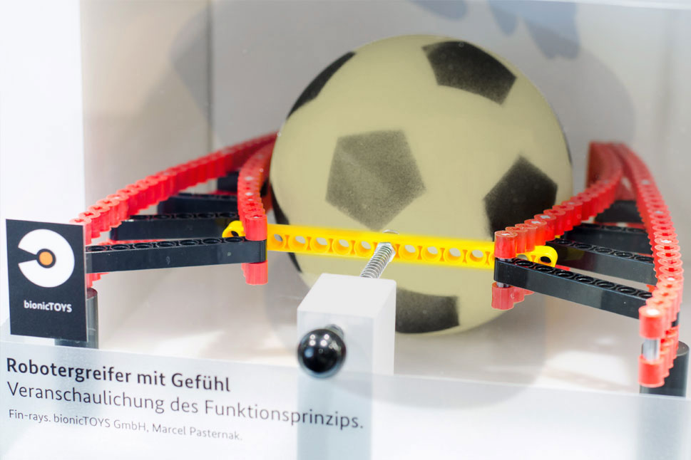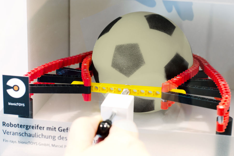Der Robotergreifer hat drei bionische Greiffinger, deren Technik auf dem „Fin Ray® Effekt“ von Fischflossen basiert: Bei seitlicher Druckeinwirkung knickt die Fischflosse nicht weg, sondern wölbt sich dem Druckgeber entgegen. Sie umschließt das zu greifende Objekt. Dieses Prinzip lässt sich auch bei den bionischen Spielzeugen von bionicToys wiederfinden.