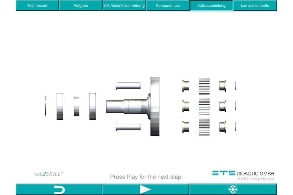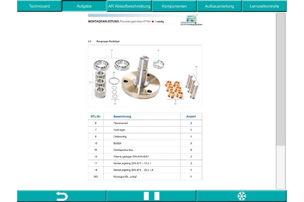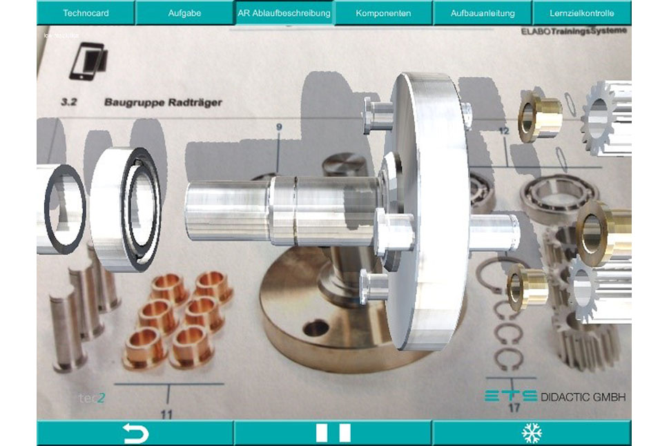 Er kann auf Smartphones und Tablets verwendet werden und ist auf die Lerninhalte der Ausbildung in Metallberufen abgestimmt. Bei dem gezeigten Bauteil und den darauf abgestimmten AR-Inhalten handelt es sich um den Radträger, eine Baugruppe aus einem Planetengetriebe.