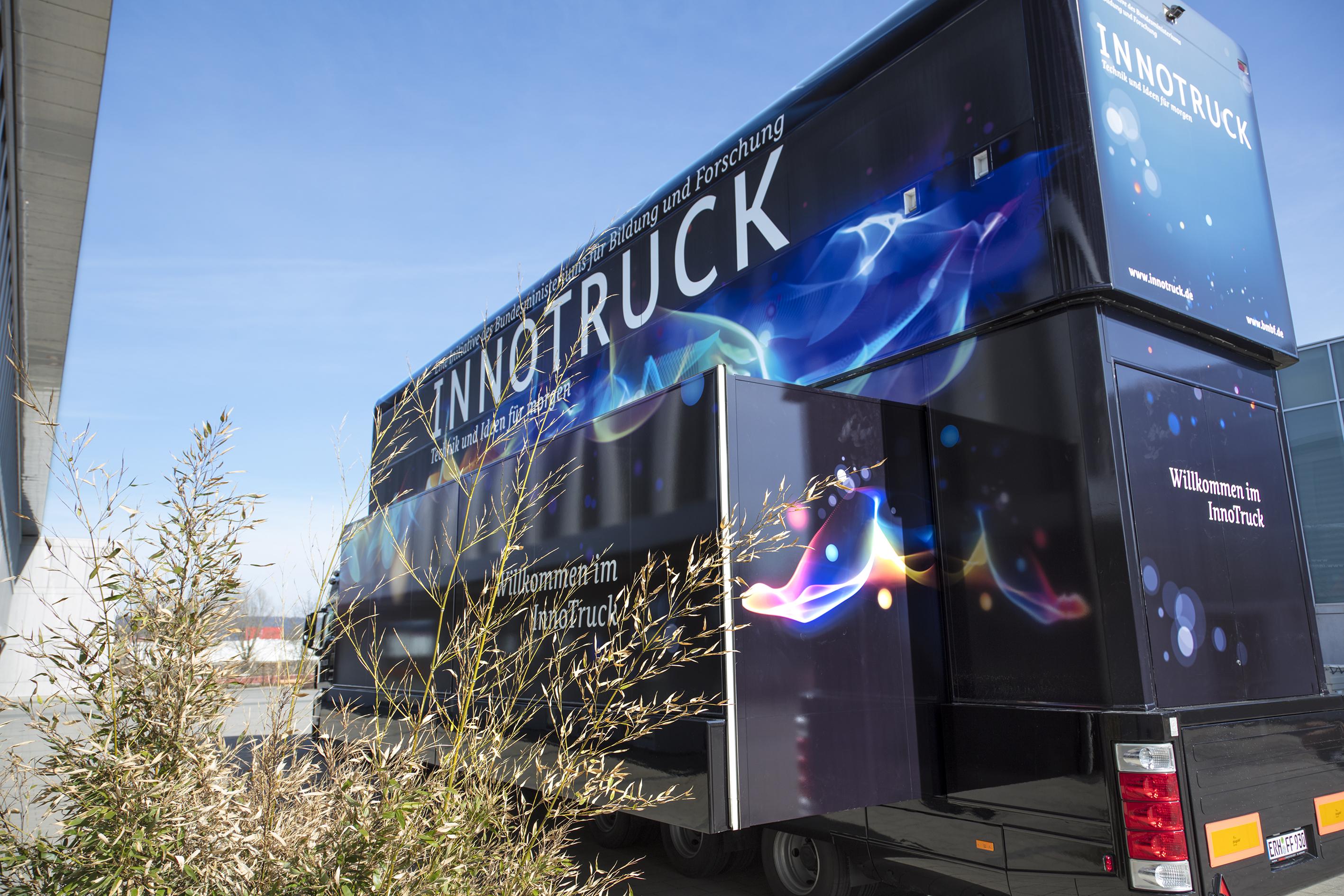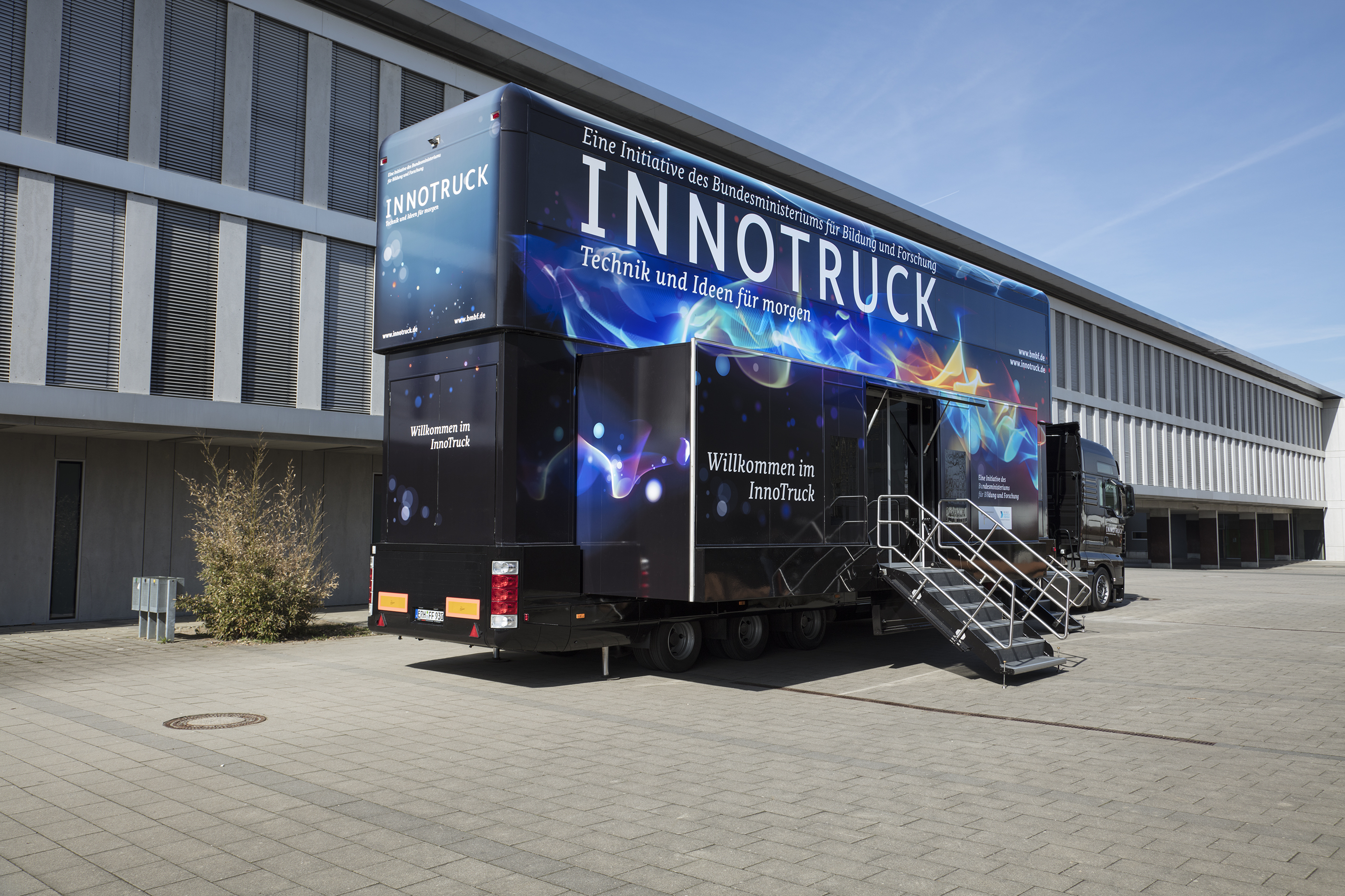 InnoTruck des BMBF in der Außenansicht mit Blick auf den Eingangsbereich.