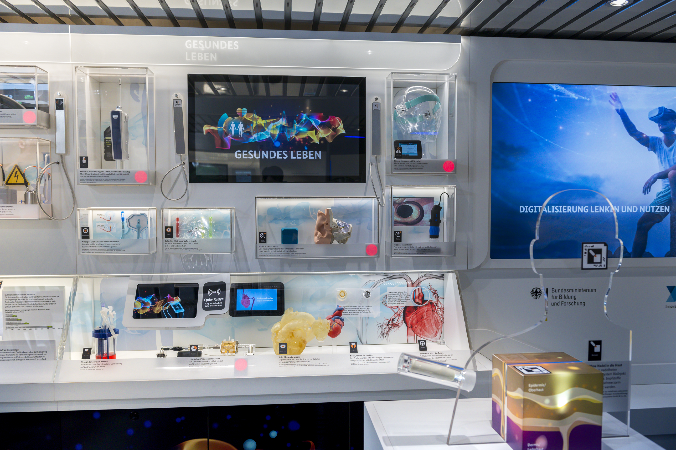 Exponat- und Themenwand zur Zukunftsaufgabe 'Gesundes Leben'.