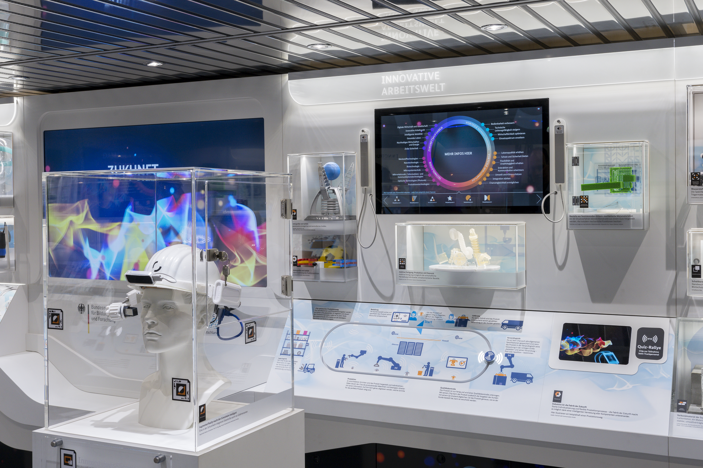 Exponat- und Themenwand zur Zukunftsaufgabe 'Innovative Arbeitswelt'.